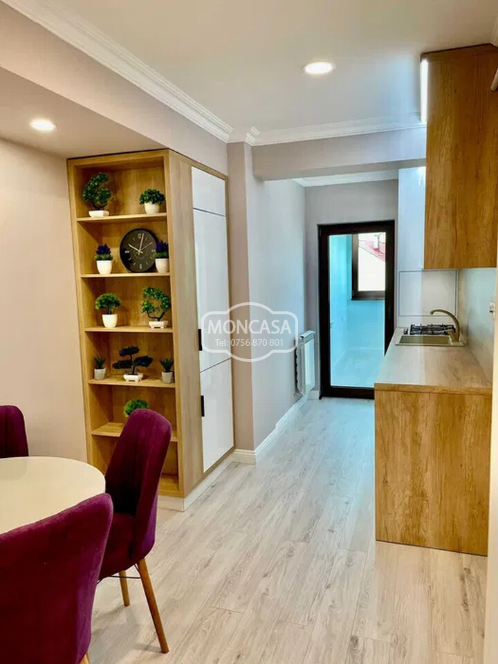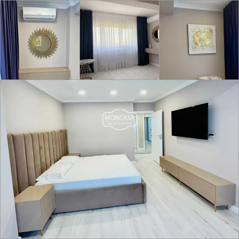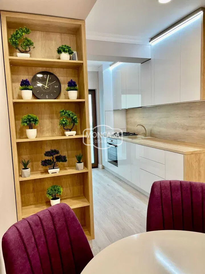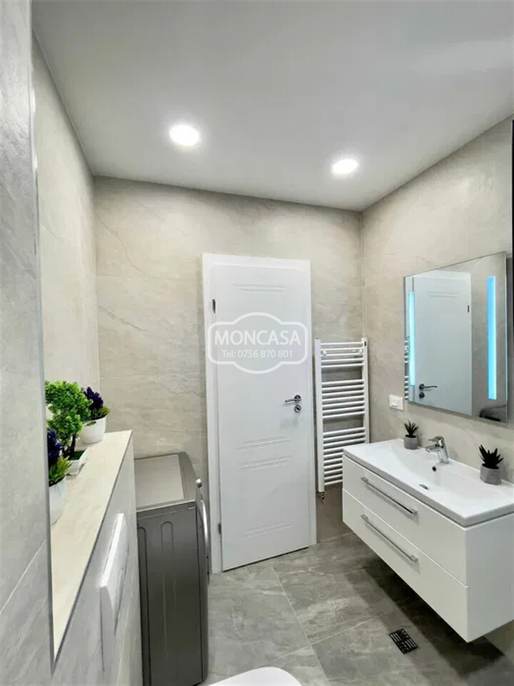 Apartamentul este in intregime mobilat la comanda din MDF vopsit , utilat potrivit unui concept de design modern cu piese din game premium. Dotari: electrocasnice incorporabile Whirlpool (aragaz electric , plita pe gaz , frigider incorporabil, hota Miele ), Masina de spalat , Televizor LG led smart 4K , iluminare interioară Led, Internet / cablu TV (DIGI-grila full de programe ).