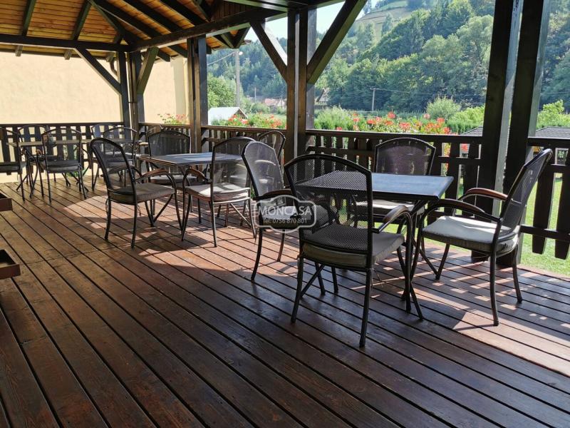 Spatiu comercial cu suprafata de 100 mp format din terasa, bucatarie, grup sanitar, bar. Bucataria este dotata cu cuptor de pizza, aragaz, cuptor si plita electrica, friteoza, cuptor cu microunde, frigidere, congelatoare, hota, mobilier, vesela, tacamuri si tot ce este necesar. Afacerea este in functiune si are un vad format de peste 20 de ani si este deja un mic brand local. Panouri solare. centrala termica pe gaz, curent 380V, apa curenta, gaz, canalizare. Teren proprietate.